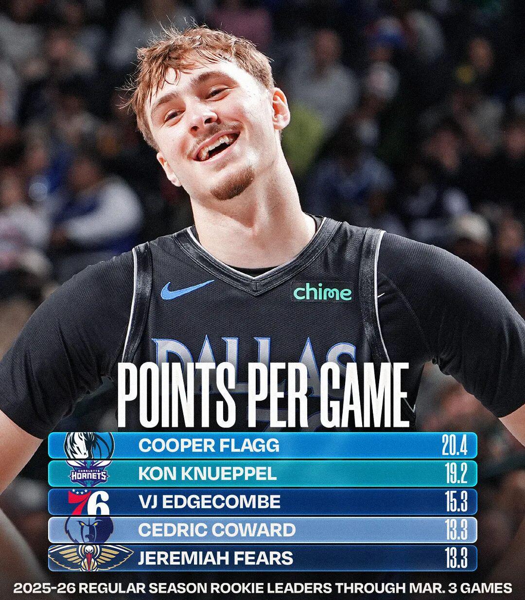 相比上一期,前三没有出现任何变化,或者我们应该这么说,从赛程接近过半开始,今年的最佳新秀就已经是克努佩尔和弗拉格的二人转,而随着常规赛进入尾声,克努佩尔的领先优势似乎越来越大。