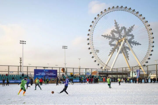2025年12月20日,哈尔滨首届“冰雪绿茵”大众雪地足球挑战赛开幕。这是参赛球员在雪地上踢球。新华社记者 张涛